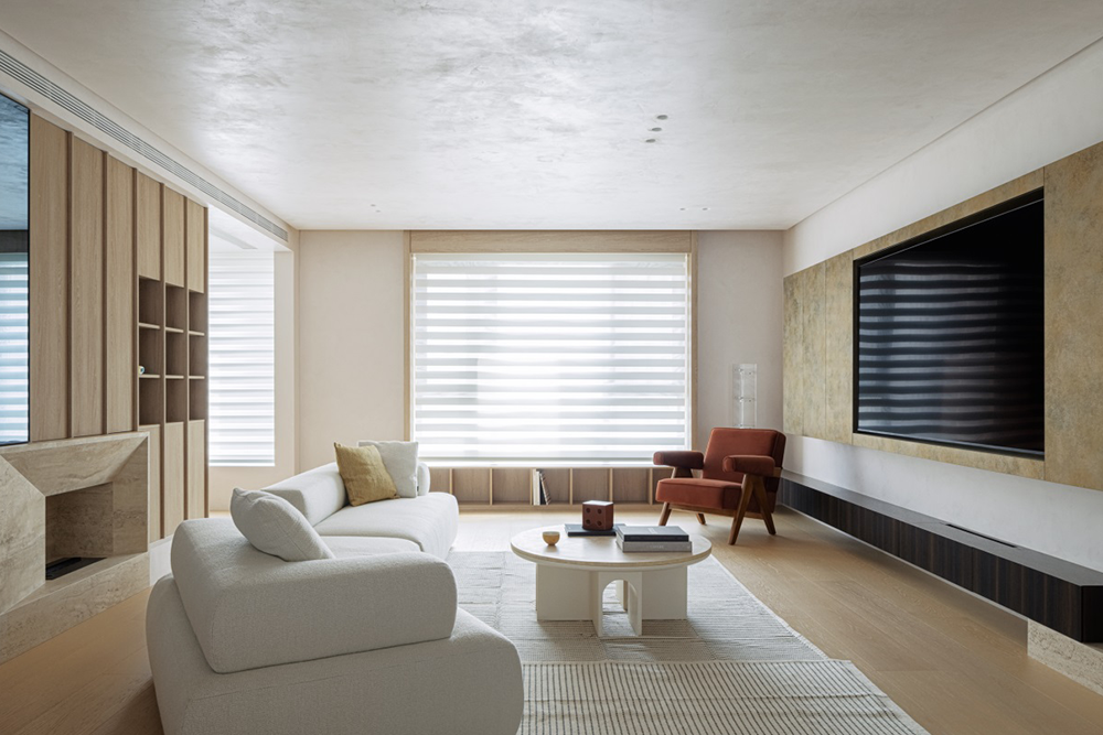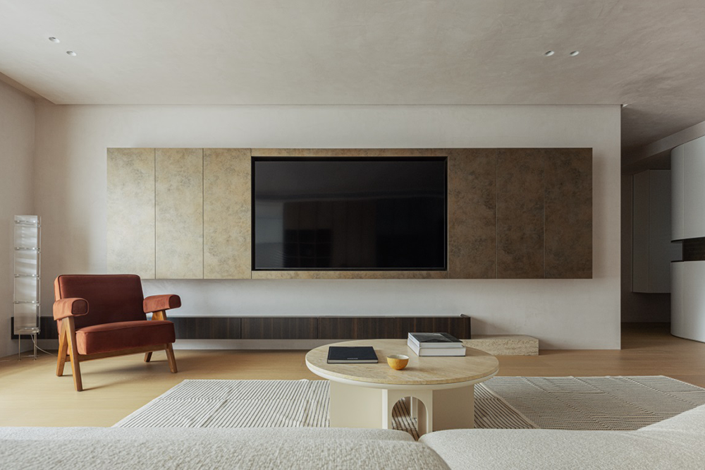 客廳電視墻以淺木色為基底,構建溫潤、輕盈的氛圍;局部金屬材質(zhì)點(diǎn)染,形成如東方畫(huà)面般的光影層次。
