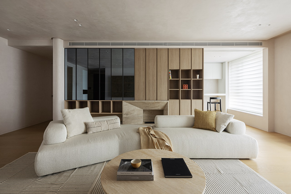 島式沙發(fā)布局與洄游動(dòng)線(xiàn),讓空間動(dòng)靜交融??蛷d設計打破原有封閉墻體,引入第二扇窗,最大化自然光進(jìn)入深處,形成通透的視覺(jué)序列。