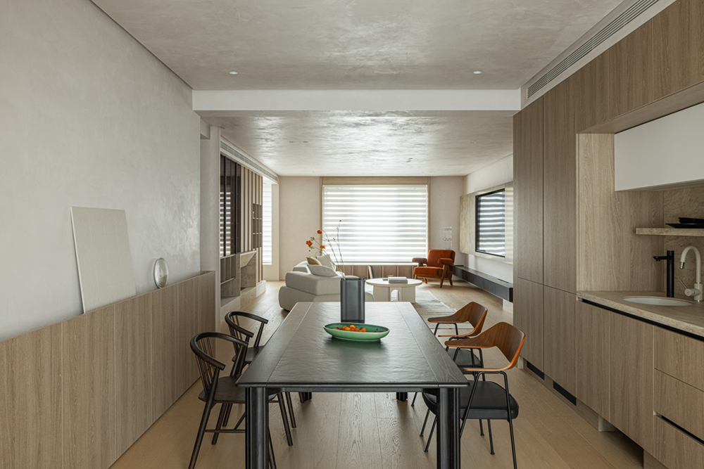 餐廳與西廚以一體化方式展開(kāi),柜體由廚房延伸至餐區,既作為儲物界面,也是烹飪與交流的連接界面。