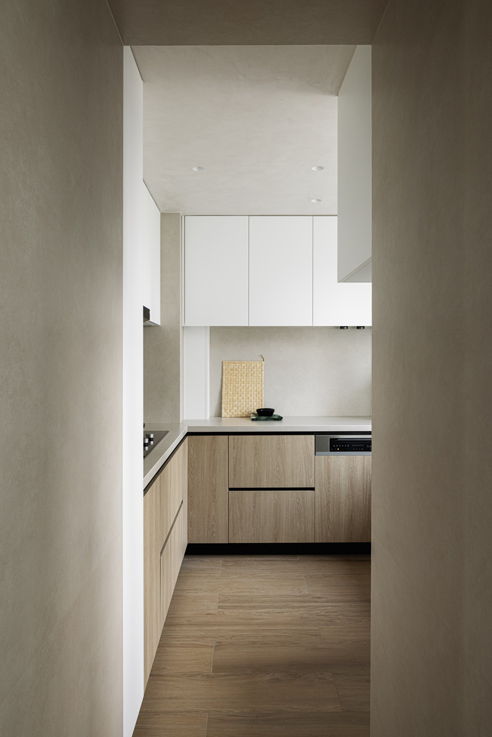中廚具備完整且高效的動(dòng)線(xiàn)。通過(guò)磨砂玻璃門(mén)進(jìn)入中廚,門(mén)洞提升至近乎滿(mǎn)高,拉伸空間尺度。