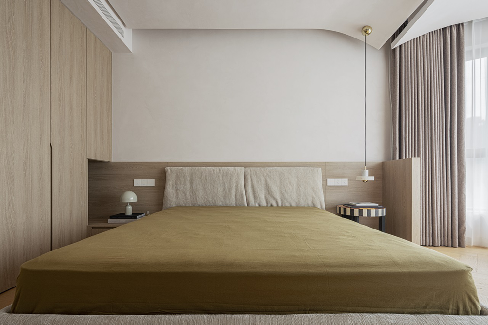 淺木色基調延續至主臥,主臥的頂面起伏,像書(shū)頁(yè)微卷,光沿著(zhù)折面鋪展,形成輕盈、柔和的建筑線(xiàn)條。