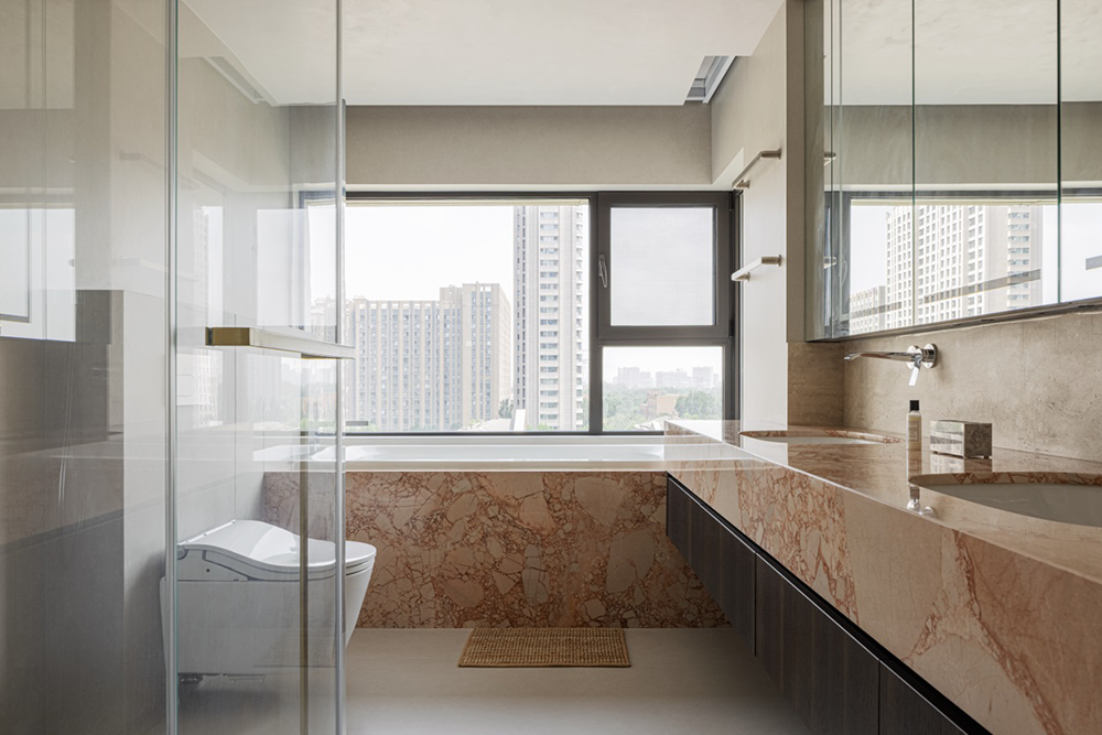 衛浴采用洞石與大理石形成克制的對比;鏡面反射、木紋吸光、巖板柔化光線(xiàn),使空間既豐盈又內斂。